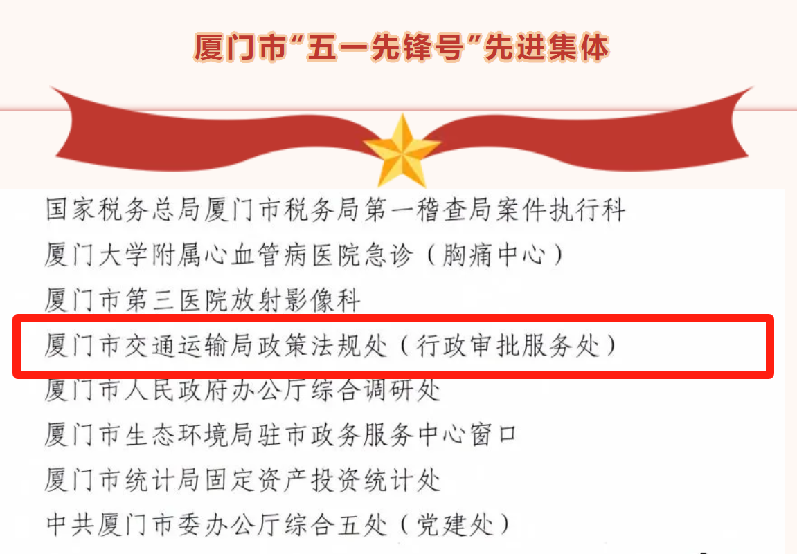 近日,厦门市总工会公布厦门市“五一先锋号”先进集体和厦门市“五一先锋号”优胜集体名单,厦门市交通运输局政策法规处(行政审批服务处)荣获厦门市“五一先锋号”先进集体称号。