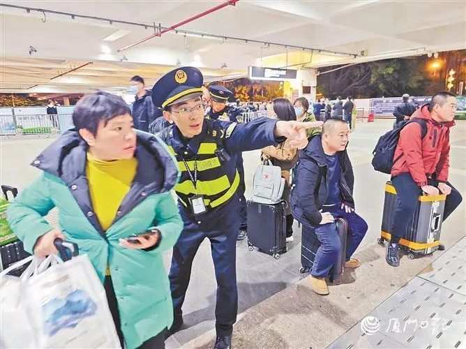 饶靖东在厦门北站执勤已8年,参与了8年春运。“春运是有规律的,春运刚启动至除夕前会出现出行高峰,春节假期最后几天也会出现出行高峰,接下来,还有一波节后出行高峰在元宵节前后。”饶靖东说,他将守岗尽责,全力保障旅客顺畅返厦。