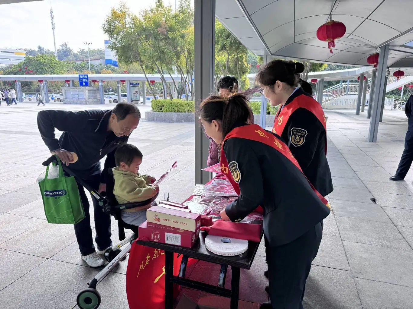 为保障春运期间旅客安全便捷出行,用心用情打造“平安、便捷、温馨”春运。2月6日,市交通运输局执法支队思明大队驻火车站便民执勤点的工作人员一大早张灯结彩,挂灯笼、中国结、贴窗花......营造浓浓的节日氛围。与此同时,在火车站南广场,市交通运输局执法支队志愿者们支起摊位,现场剪纸,并将这些承载着丰富文化内涵,代表吉祥如意的剪纸送给过往旅客,同时还向旅客们派发暖手宝、姜汤、小礼物等,守护旅客平安返乡路。
