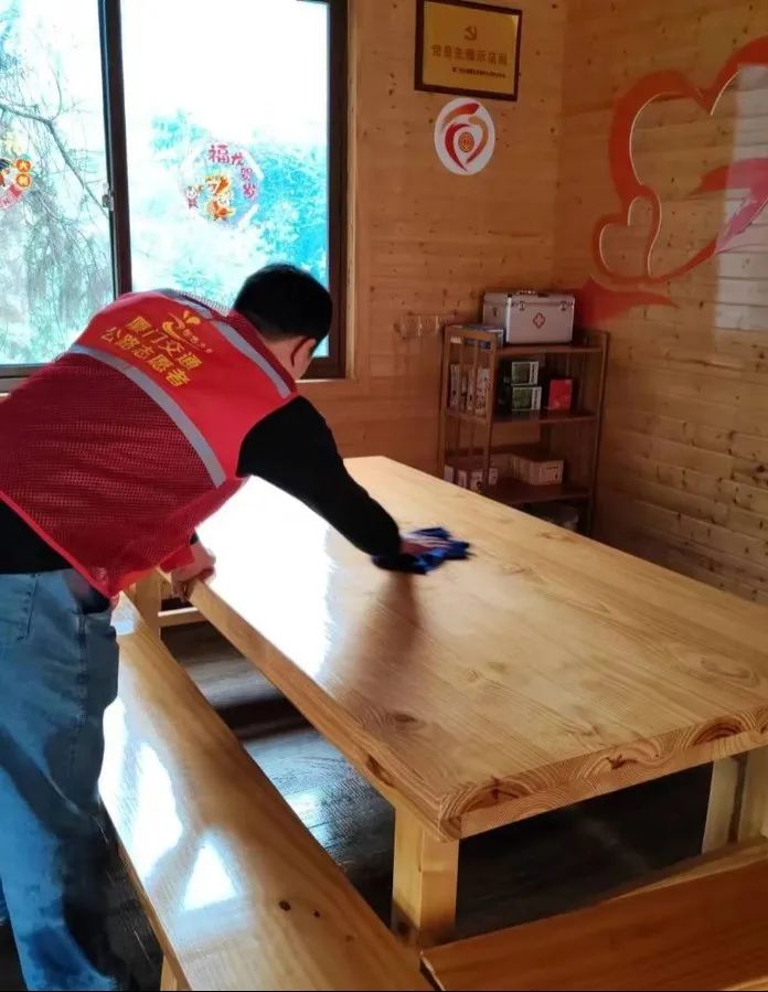 现场,志愿者们正在细致地对爱心驿站进行全方位打扫,努力打造窗明几净的驿站环境,为歇脚的旅客提供舒适的休息环境。之后,志愿者们设置志愿服务台,为过往司乘人员备上泡面、自热饭、热水、姜茶等物品,供他们休息时使用。