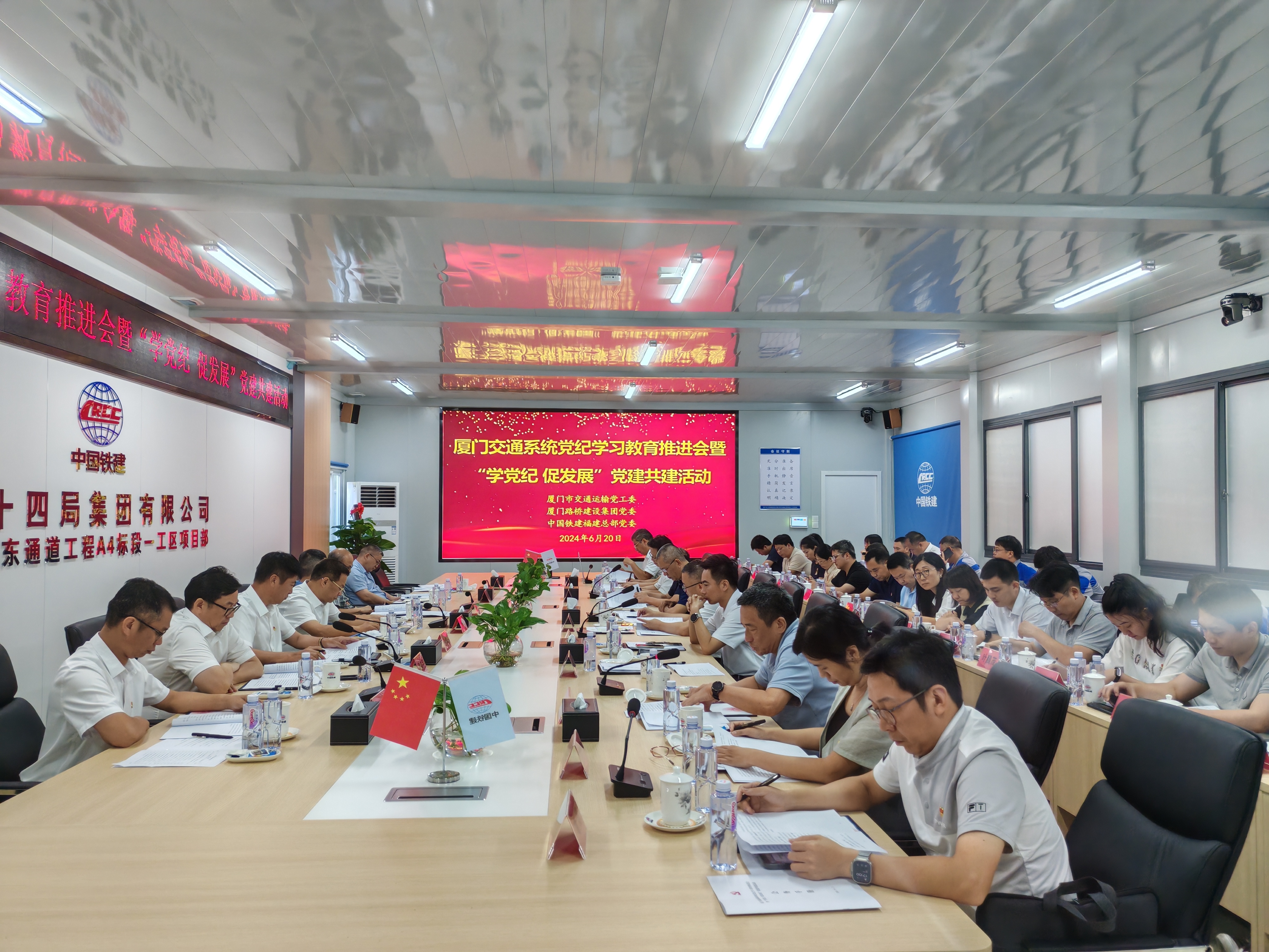 为深入推进交通运输系统党纪学习教育,加强系统单位间党建工作交流,互学互助,助力厦金大桥(厦门段)建设提速增效,6月20日下午,市交通运输党工委、厦门路桥建设集团有限公司党委和中国铁建福建总部党委联合在厦金大桥(厦门段)a4标项目部开展党纪学习教育工作推进会暨“学党纪 促发展”党建共建活动。