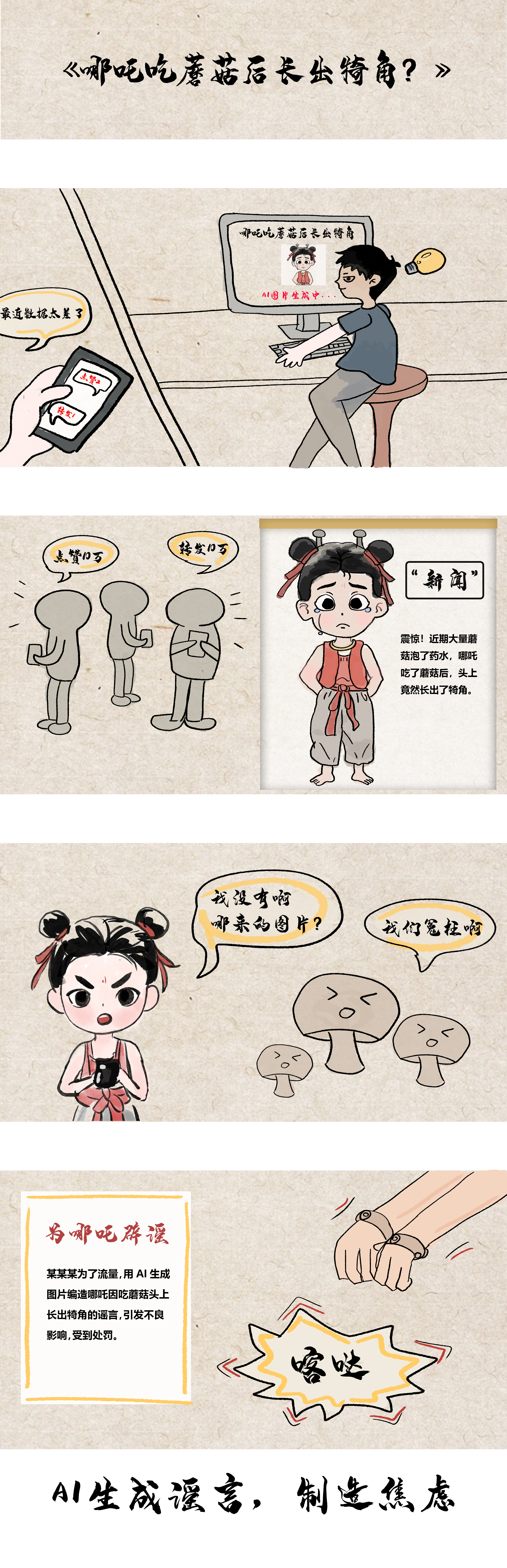 四幅四格漫画分别揭示了“旧闻拼接”“故意捏造抹黑”“截取片段信息,歪曲事实”“ai技术生成”等不同造假手段与其迷惑性,旨在让更多群众了解谣言产生机制,进而提升抗谣免疫力,不信谣、不传谣。