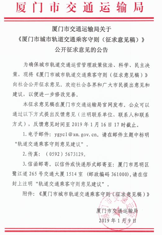 厦门市交通运输局关于《厦门市城市轨道交通乘客守则(征求意见稿)》公开征求意见的公告(已结束)-凯发k8登录入口