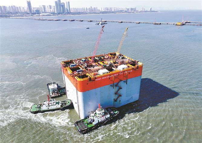 据施工单位相关负责人介绍,在沉井内共有24个竖直隔箱;出发前,建设者们用助浮板将其封上,整个沉井就形如一艘“轮船”,足以漂浮海上。